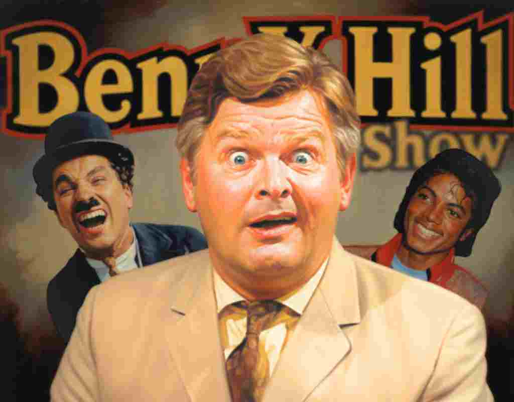 Dentro questo universo c’è anche il personaggio che tutti ricordano senza conoscerne il nome, il vecchietto calvo a cui Benny tamburellava sulla testa. Si chiamava Jackie Wright, nato a Belfast nel 1904. Jackie era il professionista del volto impassibile, capace con il suo corpo minuscolo di rimanere immobile mentre il caos gli esplodeva intorno. Negli Stati Uniti era diventato famoso quasi quanto Hill come “the little bald guy”. Quella testa liscia e inespressiva era diventata un tormentone globale. Il suo finale tipico dello show era una corsa a serpentone accelerata in cui continuava ad aggiungersi gente. Se la sua comicità a molti pareva grossolana, non lo erano i suoi ammiratori. Charlie Chaplin era il suo idolo, quello da cui aveva imparato la mimica. Hill scoprì che Chaplin collezionava i suoi video quando fu invitato a casa sua in Svizzera. Anche Michael Jackson fu uno dei fan più appassionati. Possedeva una collezione completa di videocassette dello show e, il 22 febbraio 1992, andò a trovare Benny Hill in ospedale a Londra pochi mesi prima della sua morte. Jackson, accompagnato dall’amico Brett Barnes, gli disse «You’re my hero» e gli chiese persino se voleva apparire in un suo video. Hill rispose «Of course, why not?».